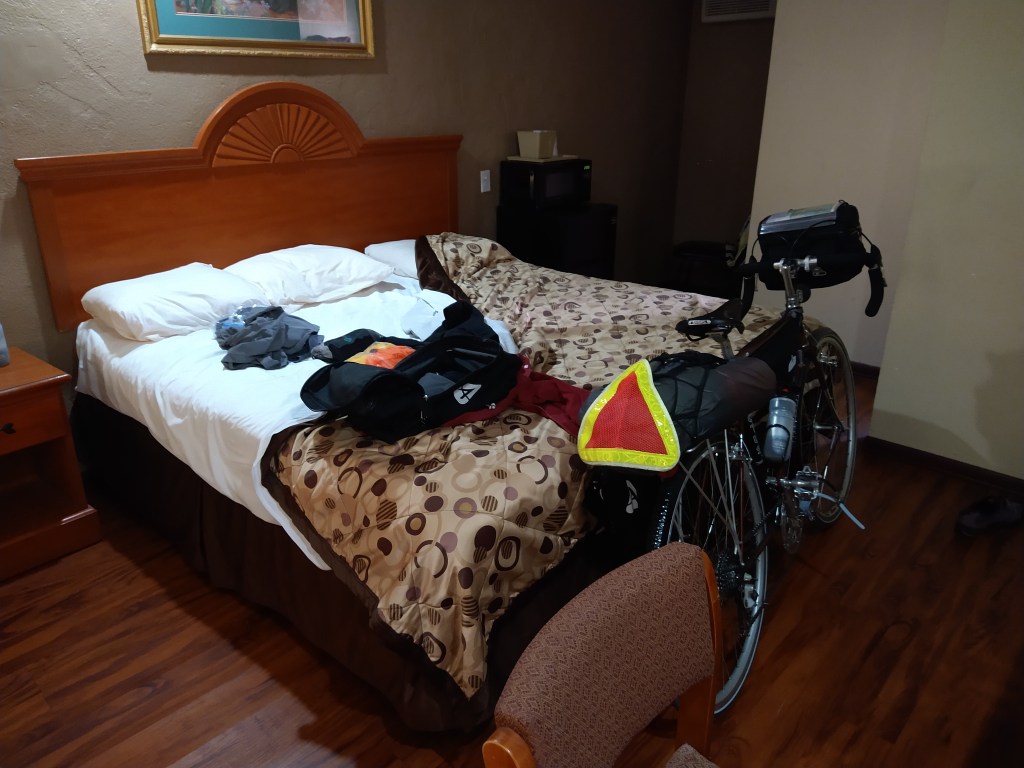 I began to think how much riding sucked, but the thought of getting into a comfortable air-conditioned hotel kept me going. As the sun set, I found a nice spot at the Gainesville Lodge, an older place, but comfortable, clean and on tomorrow’s route. The rooms look like this: