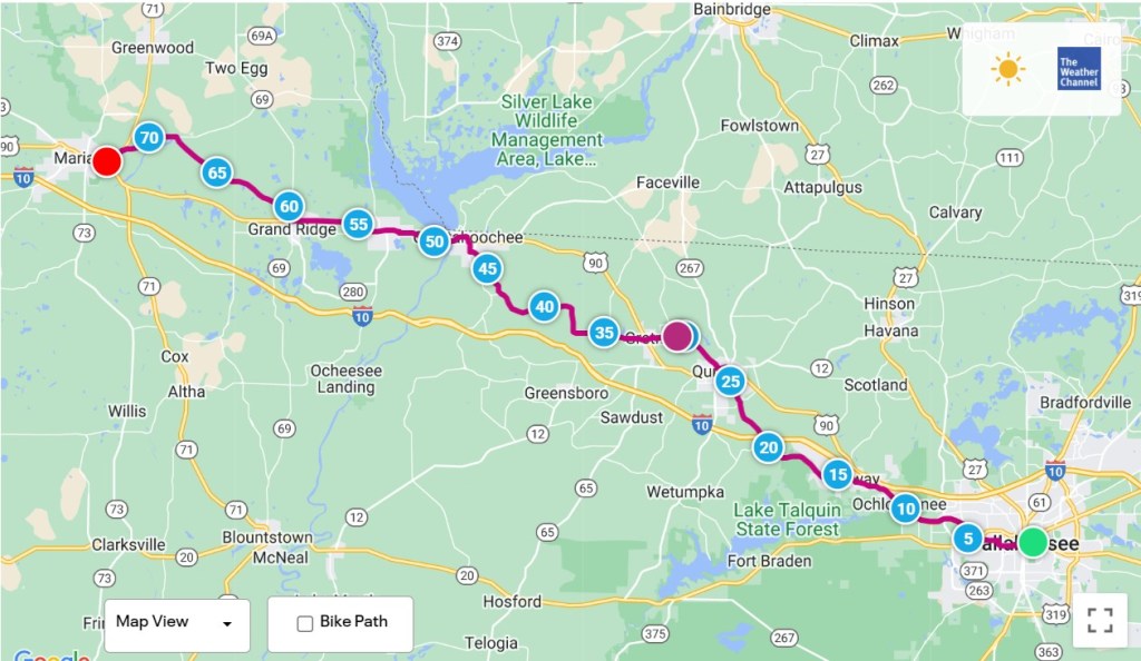 I arrived in Marianna around 4:30 and dined at Burger King. It was a successful day today. I had no soreness or fatigue, which means I’m adapting to riding longer distances with a load. The hills weren’t much of an obstacle, despite significant elevation changes, which is also a plus. To be continued….