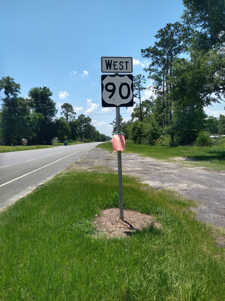 Since Highway 90 had been good to me, I wanted a picture. I got one, but notice the small sign attached to the marker. It’s obvious who placed it there, but it’s completely illegible to anyone going by at car speed, or even Ishmael speed. I doubt the person responsible majored in Marketing or sold much at their garage sale.