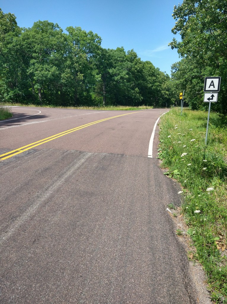 So, there was no choice but to retrace the five miles I’d just ridden and revisit the same hills in reverse order. This cost me an hour in time and 10 miles in distance, on a day when I hoped to be in the hotel early. When I got back to the junction I’d missed, I saw that state road “A” has a 90-degree bend in it, while what was state road “A” runs directly into state road “H”. I didn’t see that coming from the east, but it was displayed from the west.