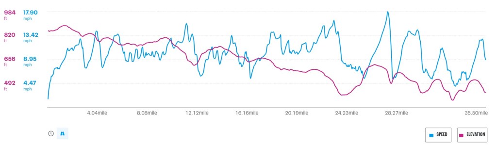Finally, the hills are disappearing as I reach the Missouri River. (Red line is elevation)