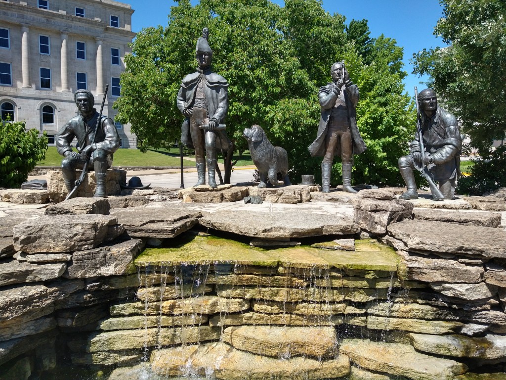 At the end of the day yesterday, Ishmael’s back tire was leaking air badly. I’d fixed the problem but thought I’d better be ready when it would, inevitably, happen again. Fortunately, there was a bike shop open on the west side of town, so that was stop one. The next was the Lewis and Clark monument near the Capitol. Lewis and Clark camped near the site of Jefferson City on June 4, 1804, and the monument includes Lewis and Clark, plus other key members of the expedition, including their dog.
