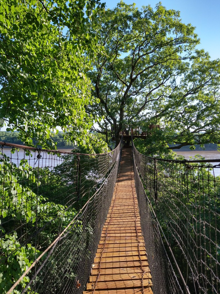 Tim and Ann live on the bluffs above the Missouri River. In a brilliantly creative move, they decided that a treehouse would maximize the enjoyment of the river view. From their back deck, a suspension bridge leads to the treehouse.