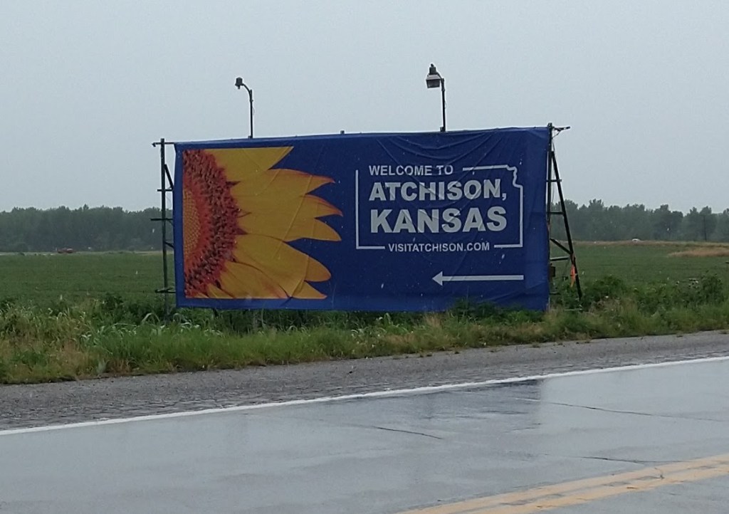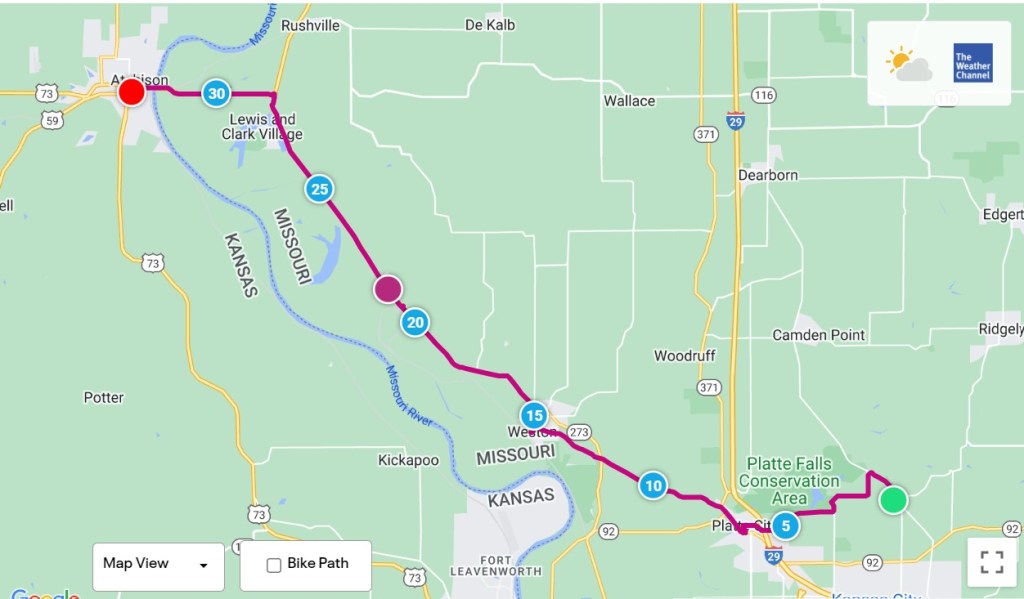 The weather forecast was for rain from around 11 to 3, so I factored that into my plans. A first thought was to attempt an 85-mile ride to Falls City, Nebraska, but the rain and effect of the elevation challenges from yesterday’s route made me set my sights a little lower. Achison, Kansas was just over 30 miles out and not in Missouri. That was good enough for me.
