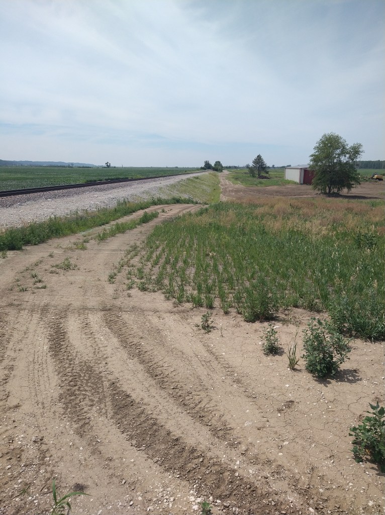 After crossing the overpass, I rode a couple of more miles and came upon another “Road Closed” sign. The map said take “Western Avenue” into Bartlett, which I was on. As I approached a large farm maintenance building, Western Avenue faded away in the back lot behind it. The road was gone. Only a rough path continued north but ended against a creek near a railroad bridge.