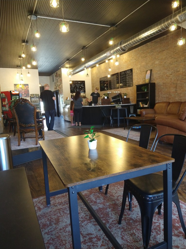I rode around for a short time to orient myself and found a place called “Downtown Coffee and Cream”, where coffee was served in the morning and ice cream in the afternoon. When I walked in there was no one but two teenage employees, possibly the children of the owner. The store was beautifully designed, and my customary vanilla malt was almost worth buying another.