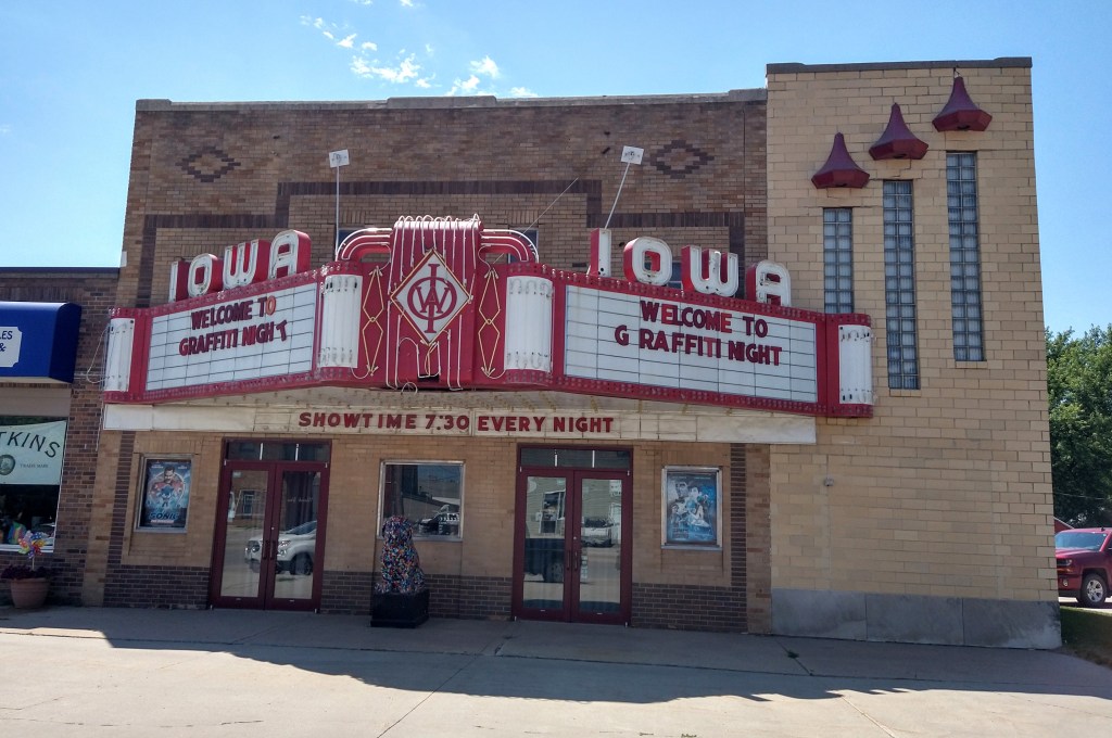 On the way out of town, heading to the campground, I spotted the second cool theater of the day. Just the logo for “Iowa” is worth the picture.