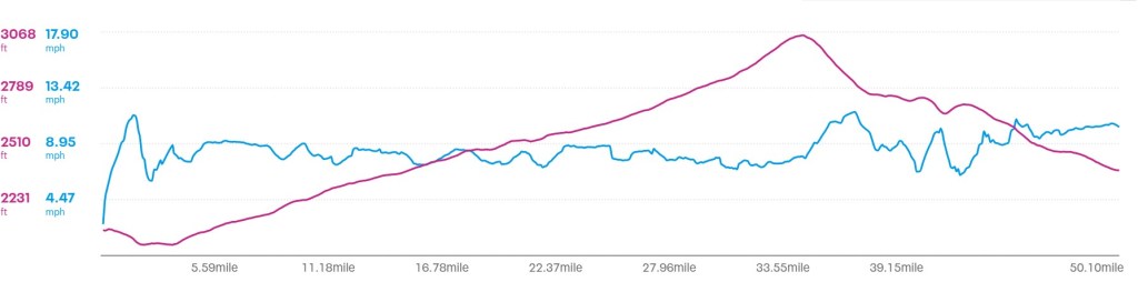 Riding against the wind for so long was tedious. I was in a low gear making about 7 to 8.5 mph on the flat. Elevation was going up for the first 35 miles, and when I got to a downhill, I had to pedal to keep Ishmael from slowing down.