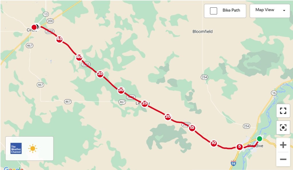 I didn’t have to get out of bed this morning to know that it was going to be a difficult day. The next logical stop on the Lewis and Clark route was Circle, Montana, 50 miles to the NW from Glendive. After riding 100 miles yesterday, doing half of that would normally have felt like a day off for me. Unfortunately, the wind doesn’t take a day off. The prediction this morning was for winds of 15 to 20 mph from exactly the direction I was going. I looked for alternate routes that might avoid the full effect of this problem, but there weren’t any that made sense. Other choices were longer or would just introduce different issues later in the trip, so I had to get used to the idea of a hard day and slow progress.