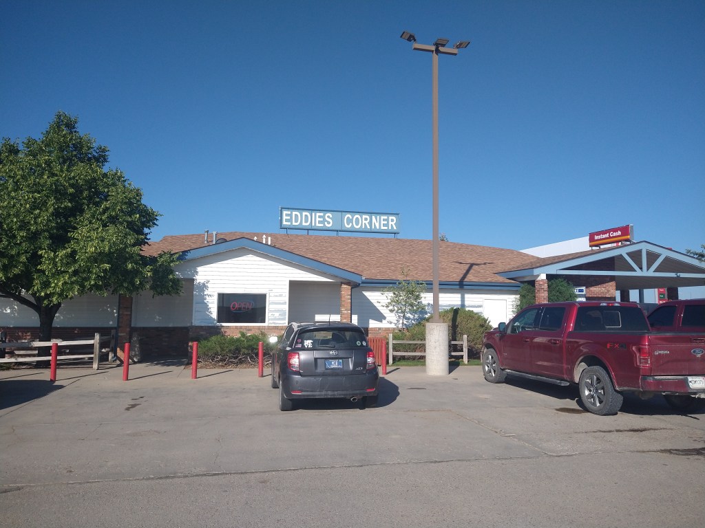 The ride out of town was a joy. The air was cool and the road was flat, things I hadn’t experienced much recently. Seventeen miles from Lewiston I reached “Eddies Corner”. It’s a gas station \ truck stop \ restaurant that’s been in business for 71 years. All the signs and references to it are spelled without an apostrophe. Eddie may only think he owns the corner.