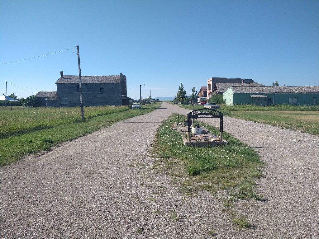 Twenty-eight miles in, I reached the town of Moccasin. It was a homestead site over 100 years ago but has faded away today. A modern grain elevator sits along the railroad tracks nearby, but there are no other signs of commercial activity.