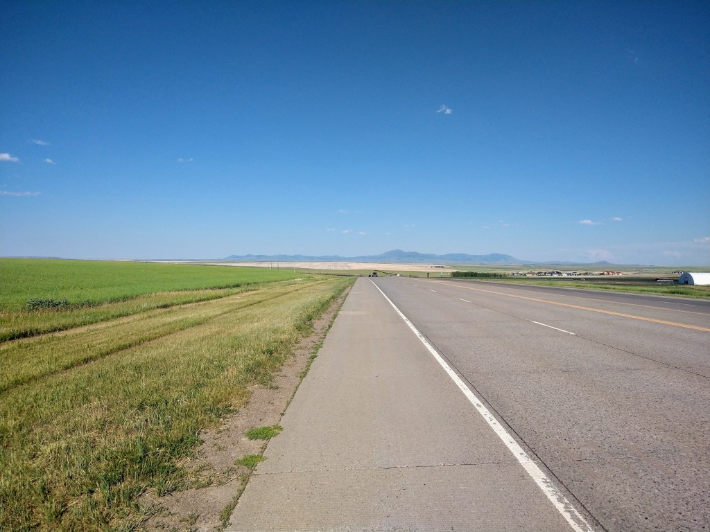 There were 20 miles left to Great Falls, and the wind was fluky. I was on a highway with a wide shoulder, but speed varied with the wind and hills. With the mountains behind me, the plains returned.