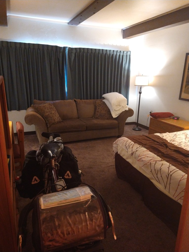 I hit the city limits around 6:00 PM and was in the Midtown Motel a half hour later. It was adjacent to a Perkin’s restaurant, which I took immediate advantage of. A good way to end the day!