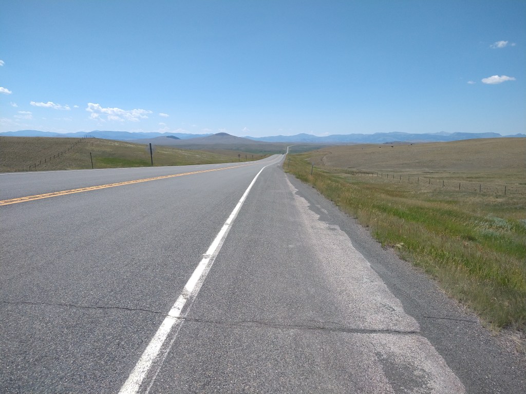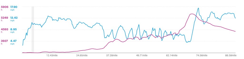 If you look at the elevation profile chart, you’ll see a long climb from 20 miles to 70 miles. You’ll also see that the general direction was to the SW, which was exactly the direction of the wind. Uphill is tolerable, but uphill and against the wind sucks. I’d experienced this in eastern Montana on the ride to Circle, but that was 50 miles with less climbing.