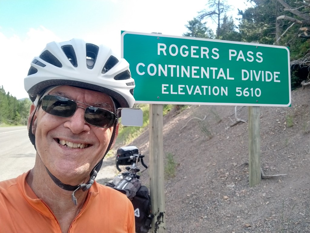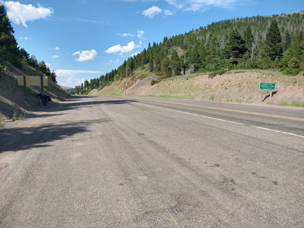 I’d been going up and down all day, but as I got closer to Rogers Pass the road transitioned to a segment of pure uphill for several miles. Not super steep, but consistent. My GPS indicated I was approaching the summit, but after rounding several curves with another one immediately in view, I wasn’t sure when it would show up. Finally, I looked ahead and the road wasn’t going up anymore.