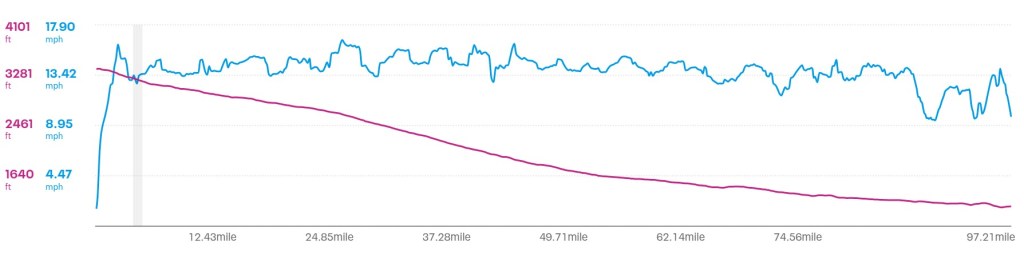 I got up early but left late. Whether it was overconfidence in knowing that winds were favorable and it was all downhill, or just lack of concentration, it was after 10 when I got on the road. Fortunately for me, Ian was correct. I was speeding along for the first several miles, which got me motivated to keep it going. The note of caution for the ride was that there were no services available for 65 miles, which meant carrying everything needed to eat and drink for that length of time.